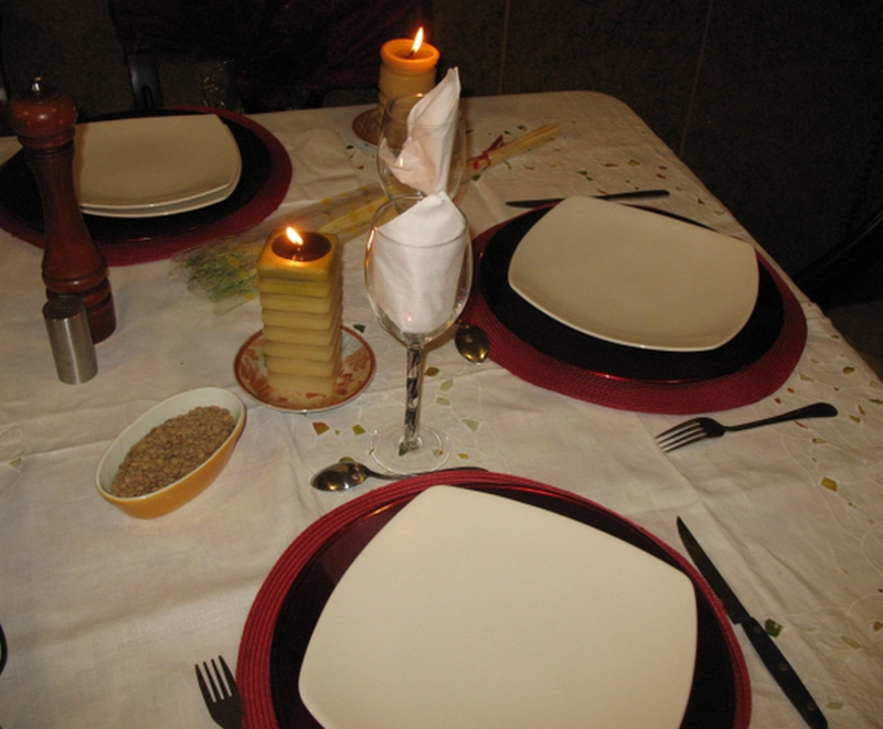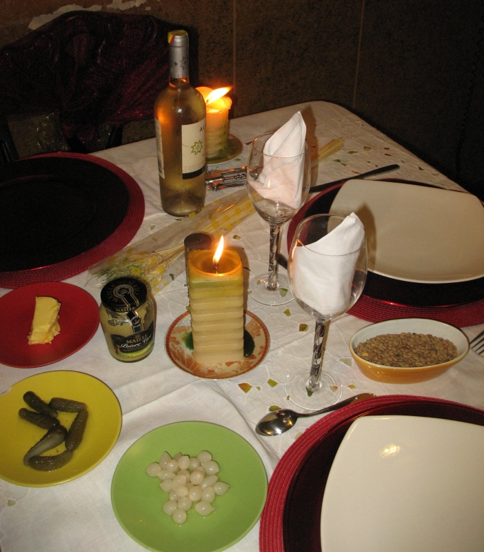 Vous remarquerez les lentilles et la gerbe de blé, objets indispensables du 31 décembre. Le moulin à poivre vient des États-Unis (acheté chez Home Center) – privilégiez les modèles avec un mécanisme en métal.