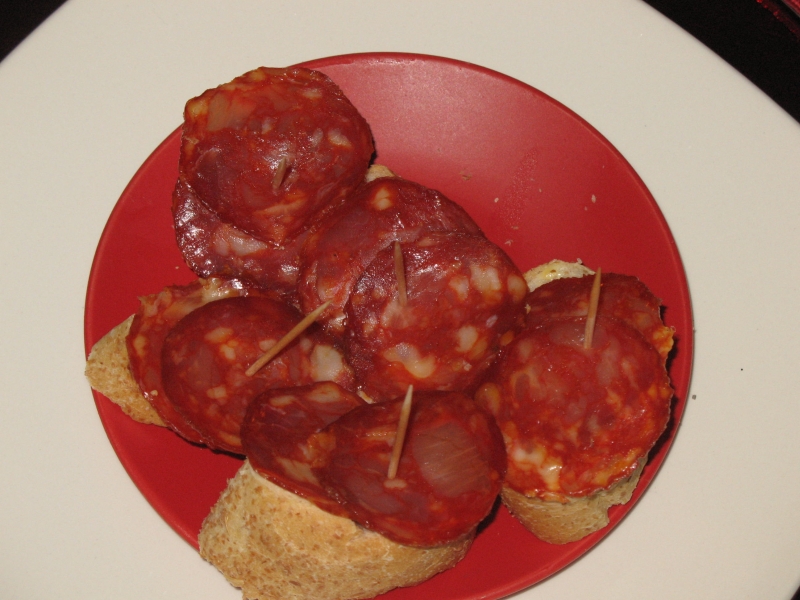 Chorizo doux d’Espagne (Carulla) sur tranches de baguette intégrale (Carulla)